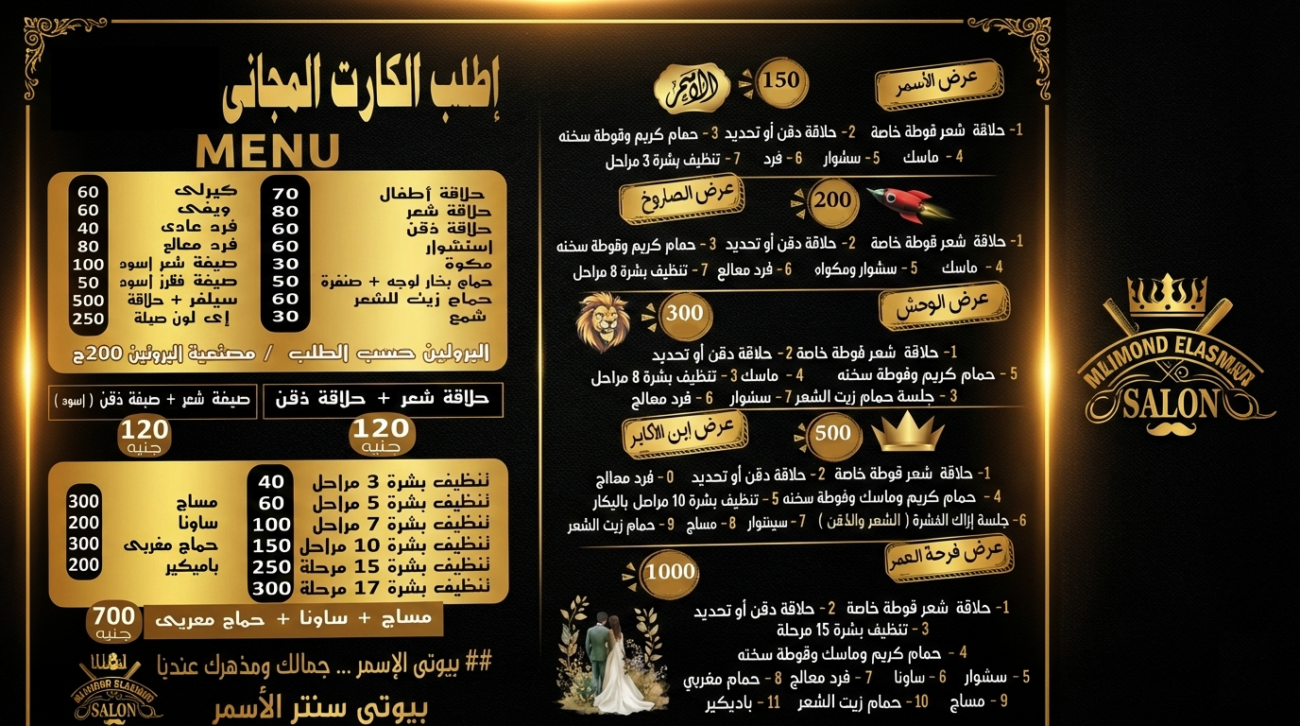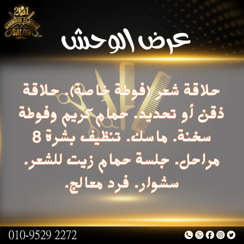 حلاقة شعر (فوطة خاصة). حلاقة ذقن أو تحديد. حمام كريم وفوطة سخنة. ماسك. سشوار ومكواة. فرد معالج. تنظيف بشرة 5 مراحل.